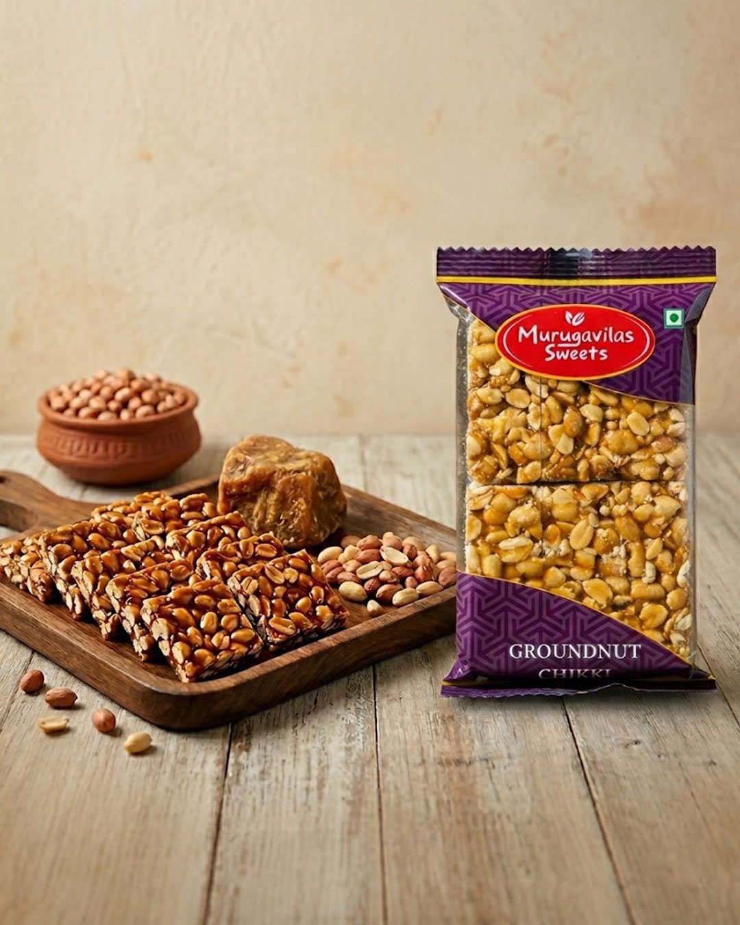 Murugavilas Groundnut Chikki, traditionally known as கடலை மிட்டாய் (Kadalai Mittai), is a classic South Indian crunchy sweet crafted from carefully selected roasted groundnuts and pure cane jaggery. Made using traditional preparation methods, this delicious brittle offers a perfect blend of nutty richness and natural sweetness.